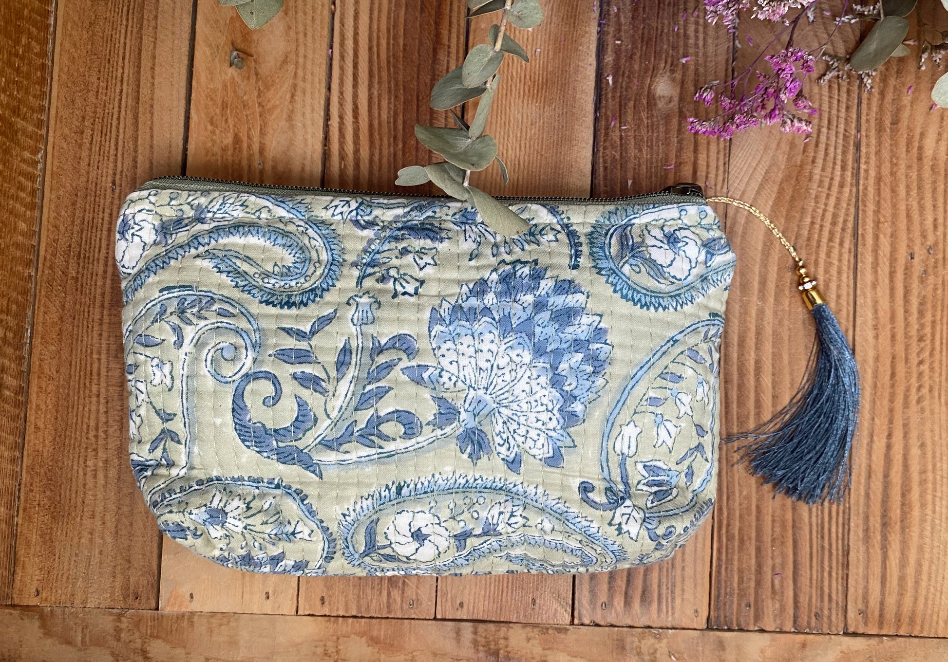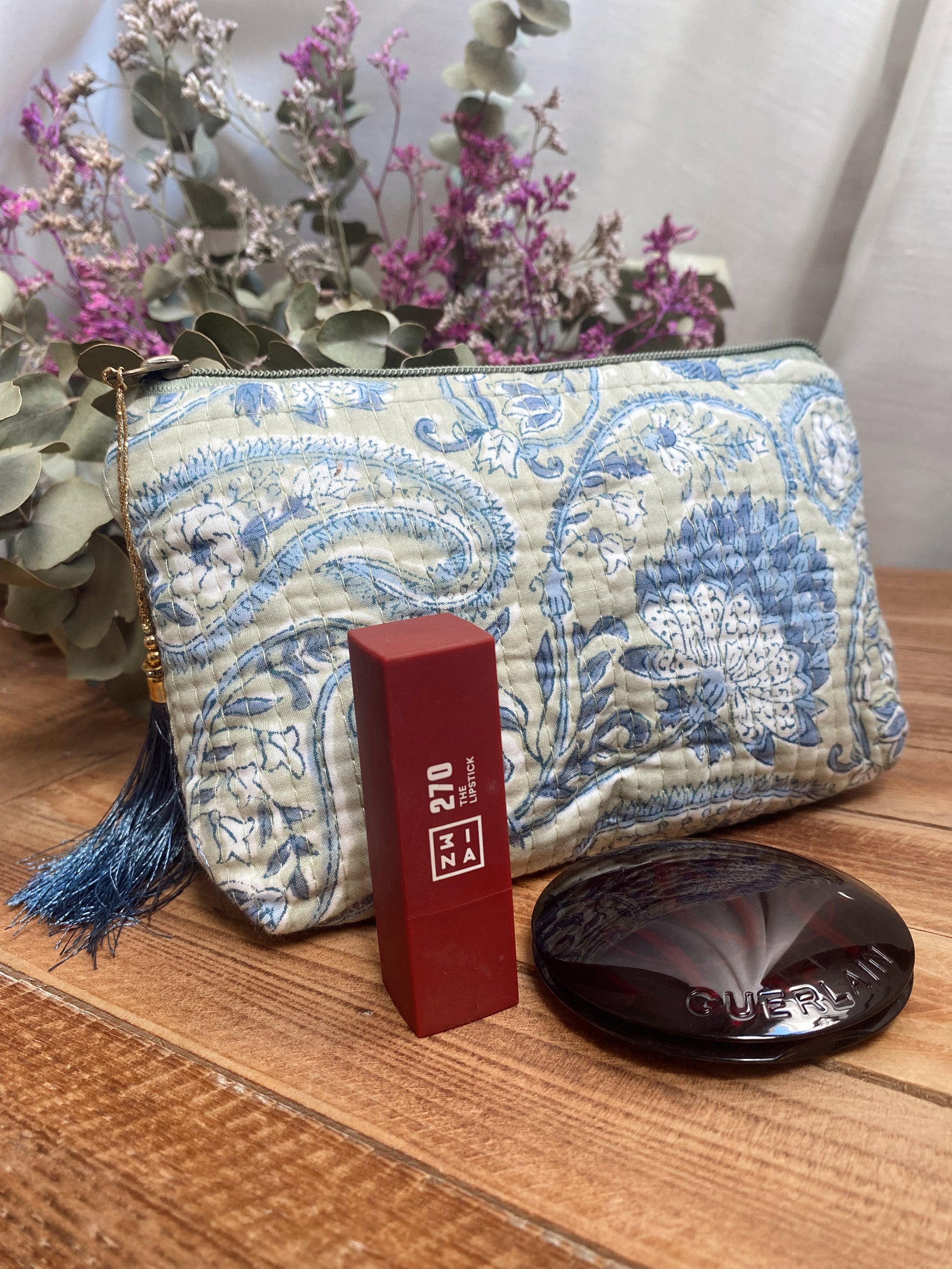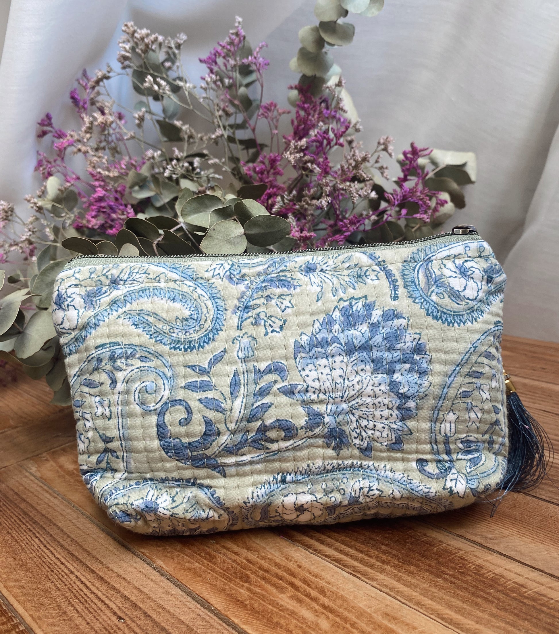 Neceseres confeccionados con telas indias con una gran variedad de estampados. Su diseño acolchado los hace suaves, ligeros y perfectos tanto para usar como neceser, porta-maquillaje, estuche o cartera.