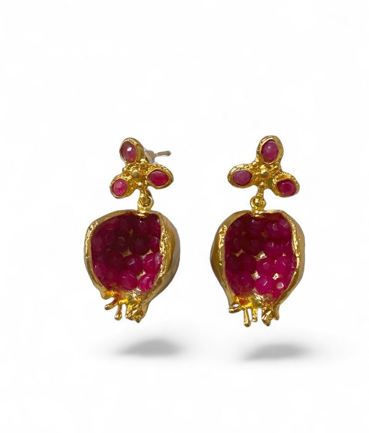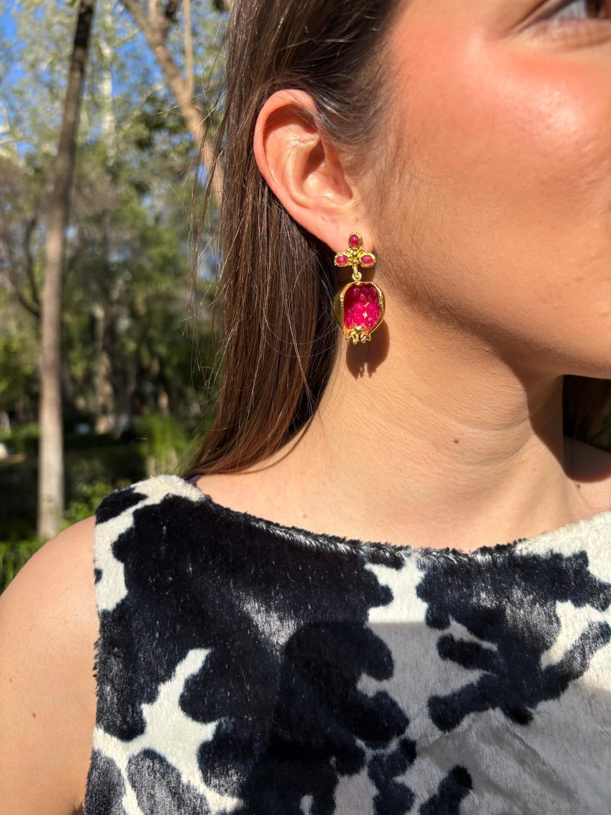 Pendientes de latón con baño de oro 18k y piedras en tono buganvilla.